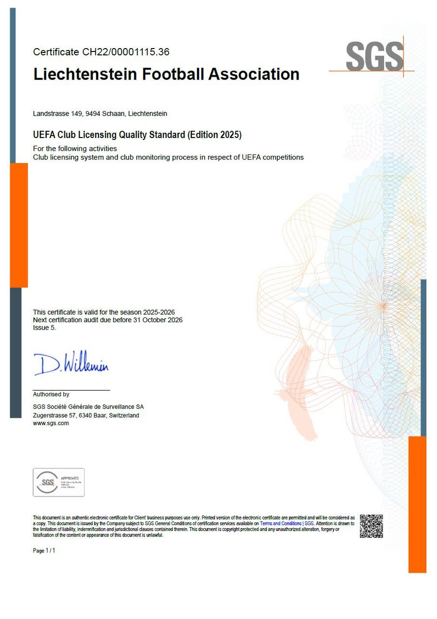 Der Lizenzierungs-Standard des Liechtensteiner Fussballverbandes wurde am 17. September 2005 erstmals durch die SGS im Auftrag der UEFA zertifiziert. Die Zertifizierung ist für drei Jahre gültig und wird jährlich im Rahmen einer Routineüberprüfung kontrolliert.